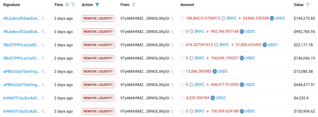 On January 13th, Beijing time, former New York City Mayor Eric Adams announced the launch of the NYC token on social media (token contract address: Ho5fkxk9uqUuVN5kt7TUFacduWCpKPAuYkM9HD3KAXA2). However, 30 minutes after the token's launch, liquidity was gradually removed from the liquidity pool created at address 9Ty4M4t9MZArhJBKFWbYrzeqdMf2Ua5eHWSRW3LXKyGt.