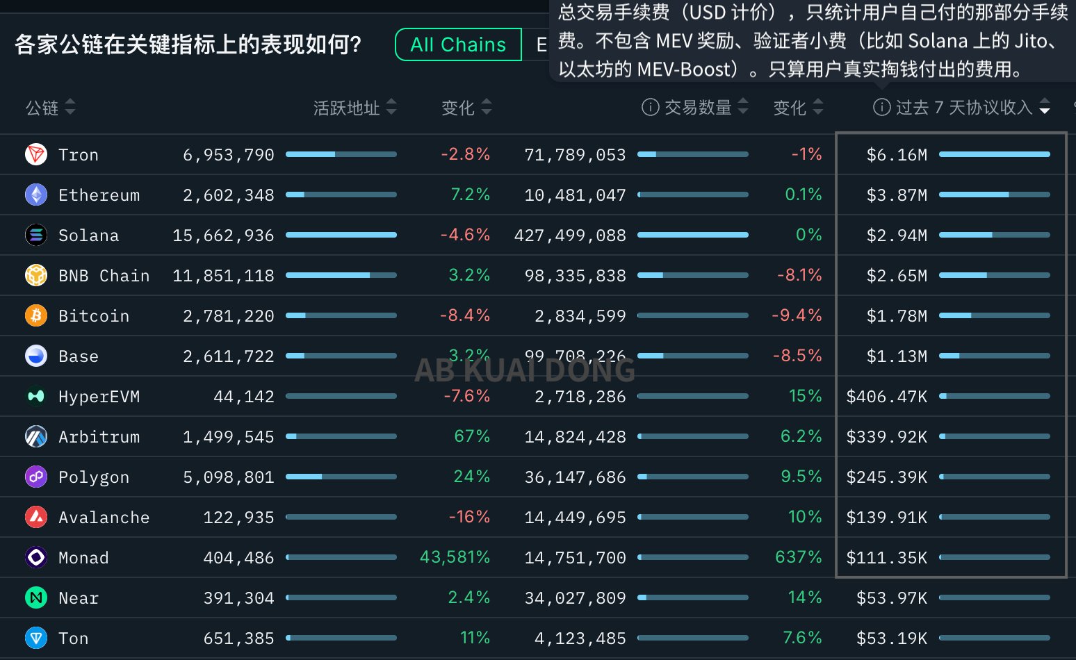 PANews reported on November 28th that, according to crypto KOL AB Kuai.Dong, citing Nansen data, only 11 public blockchains generated over $100,000 in revenue in the past seven days. The top six are Tron, Ethereum, Solana, BNB, Bitcoin, and Base. They account for over 95% of on-chain user spending. The vast majority of the remaining public blockchains have low activity, with some generating close to zero revenue.