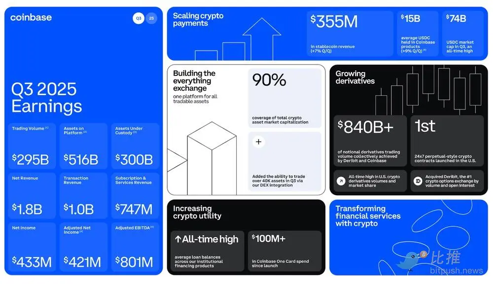 The revenue structure reflects this dual focus. Revenue for the third quarter of 2025 was $1.8 billion, with subscription and service revenue setting a quarterly record of $747 million (41% of total revenue). Stablecoin revenue from the USDC partnership contributed $354.7 million, a 44% year-over-year increase. Staking business brought in $185 million. Driven by ETF inflows, assets under custody exceeded $300 billion, with custody fees reaching approximately $143 million.