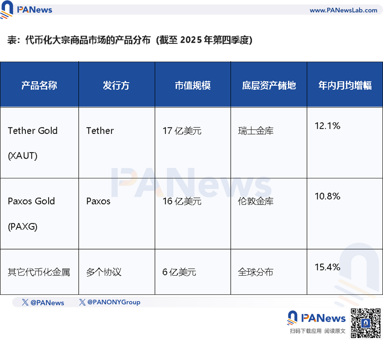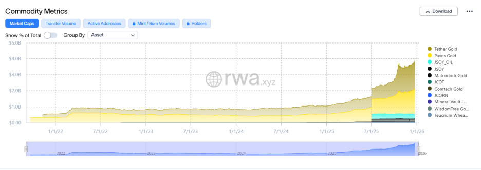 As of December 26, the total market capitalization of tokenized commodities had climbed to $3.95 billion, an increase of nearly $3 billion since the beginning of the year, representing a year-to-date growth of approximately 300%. Commodities have become the most active asset class in the RWA tokenization space after government bonds, with funds rapidly flowing into the tokenized commodities market.