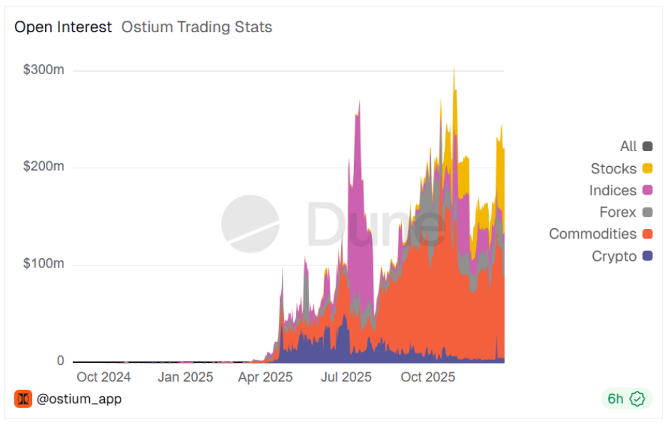 This enthusiasm has also spread to the crypto market. Fueled by the precious metals bull market, the pace of commodities being tokenized on blockchains has accelerated this year, with the total market capitalization of tokenized gold and silver approaching $4 billion. Many Perp DEXs (decentralized perpetual contract exchanges) have successively listed precious metals. For example, the leading protocol Ostium has seen its cumulative trading volume exceed $30 billion, with perpetual contracts for commodities accounting for as much as 40% of that.