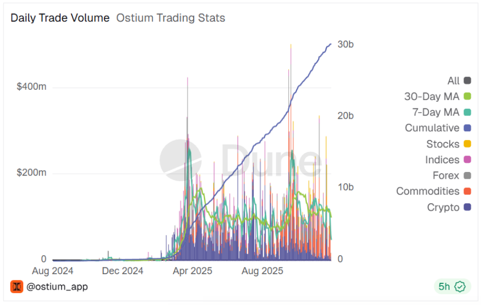 To date, Ostium's cumulative trading volume has surpassed the $30 billion mark, with commodities trading accounting for approximately 40% of the total. The platform's growth trajectory reflects a diversified shift in the crypto user profile: from a singular focus on "crypto speculators" to include "macro hedge traders."