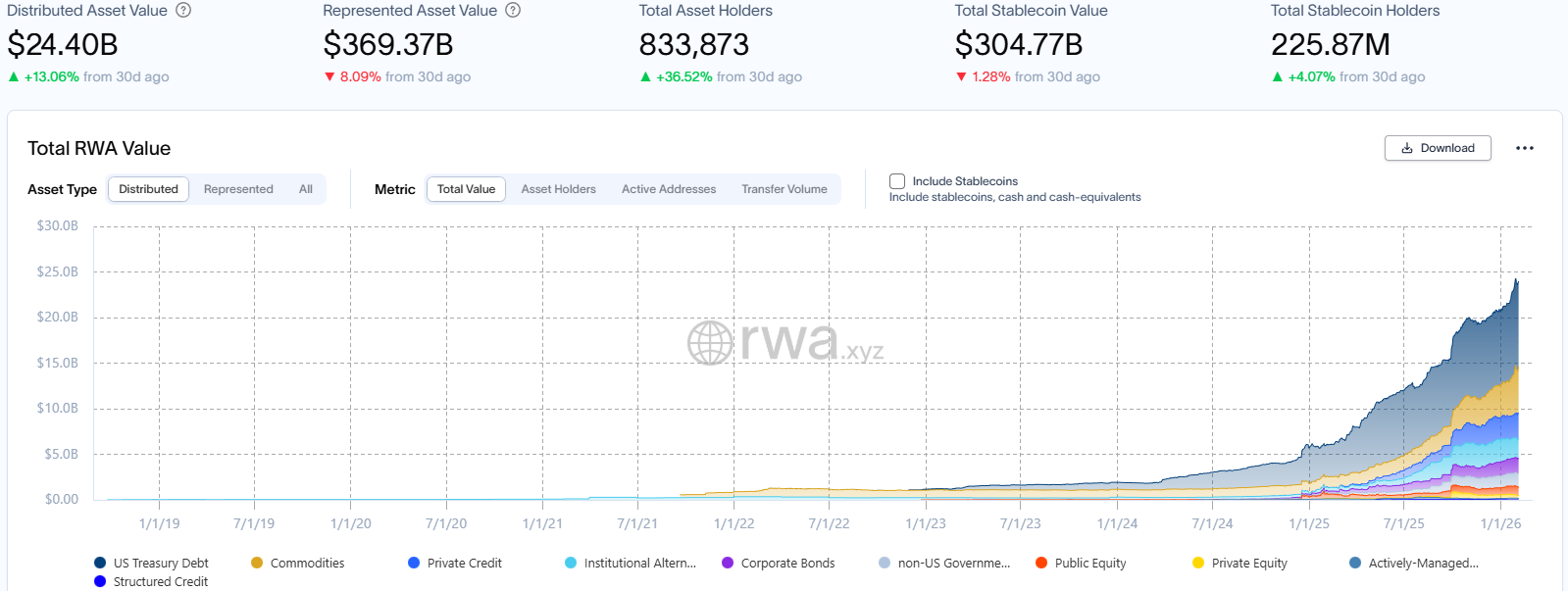 According to the latest data disclosed by RWA.xyz, as of February 6, 2026, the total market capitalization of RWA on-chain reached US$24.4 billion, an increase of 13.06% compared to the same period last month, continuing its rapid growth; the total number of asset holders increased to approximately 833,900, a significant increase of 36.52% compared to the same period last month, showing remarkable growth. The growth rate of holders far exceeded the growth rate of scale, highlighting that the driving force of market growth has shifted from the growth of capital scale to the expansion of user base.