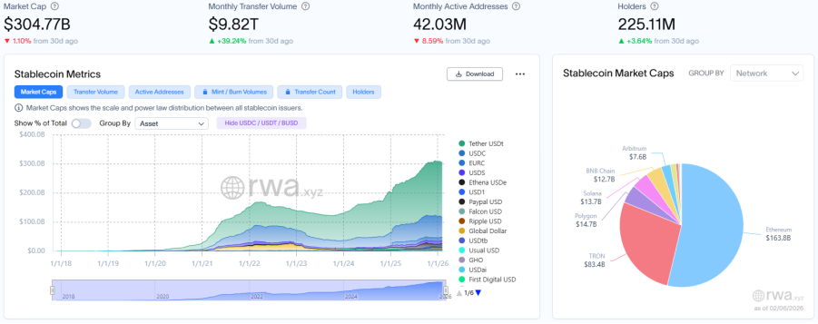 The total market capitalization of stablecoins shrank to $304.77 billion, a slight decrease of 1.1% compared to the same period last month, continuing the contraction trend; monthly transaction volume surged to $9.82 trillion, a dramatic increase of 39.24% compared to the same period last month, and the turnover rate of existing funds (transaction volume/market capitalization) climbed to 32.7 times.