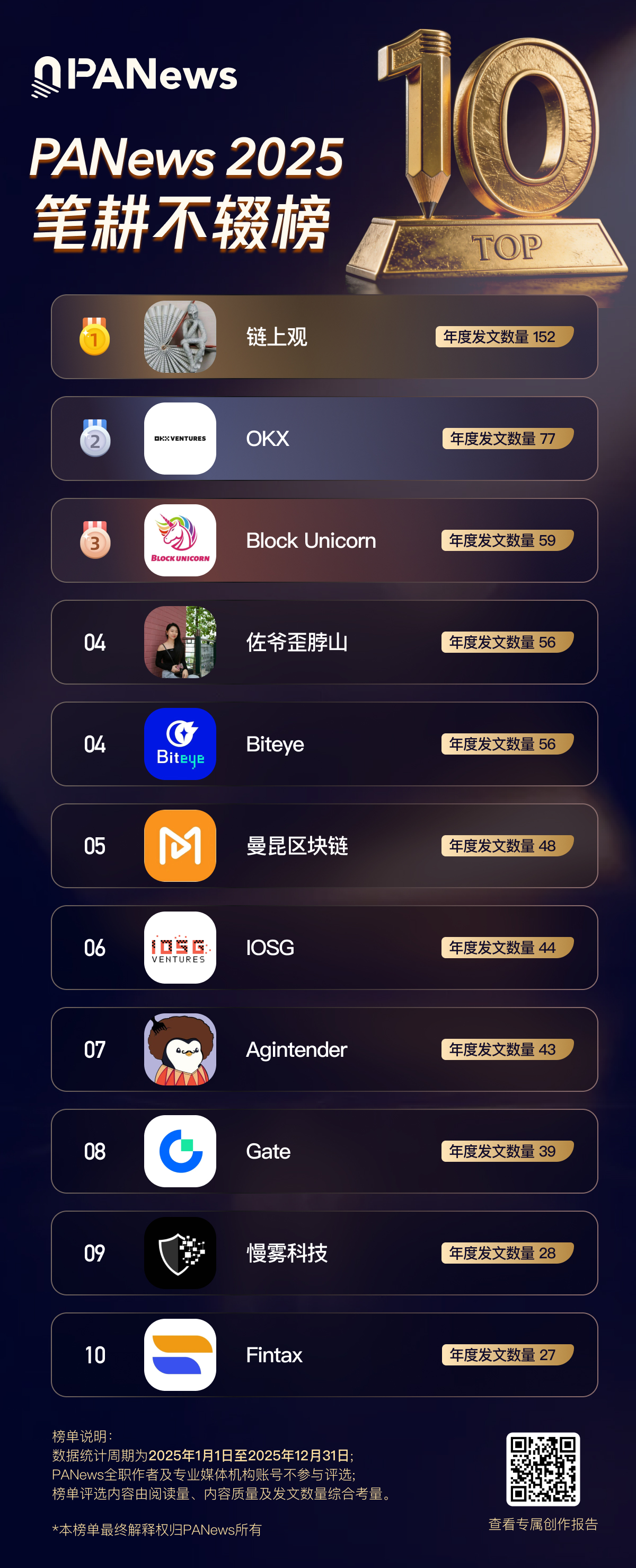 Congratulations to all the creators who made it onto PANews' four major lists for 2025! Your insights have guided the market narrative. Of course, every thought and creation deserves to be seen. Thank you to all columnists for their hard work over the past year. Let's achieve even greater success in 2026!