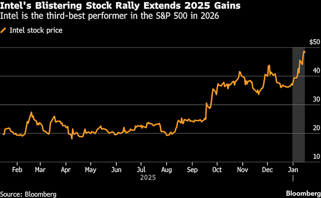 INTC stock price movement from Q4 2025 to Q1 2026 (Source: Yahoo Finance / TradingView)