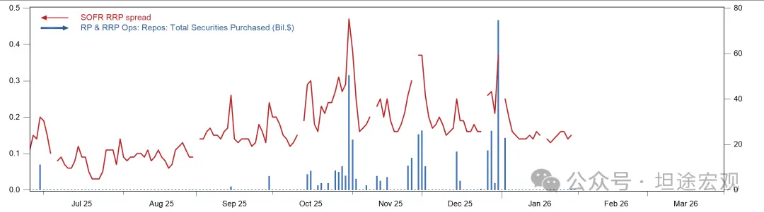 1) After Q4 2025, ONRRP usage essentially dropped to zero, the SOFR-ONRRP spread rose to a historical high of 25bps, and SRF usage remained consistently above zero. These signals indicate that the liquidity situation in the US interbank market has shifted from abundant to slightly tight. Dealer banks, hedge funds, and other overnight funding demanders have encountered difficulties in obtaining funding and high funding costs. This is why the Fed restarted technical balance sheet expansion (RMP) last December (Figure 1).
