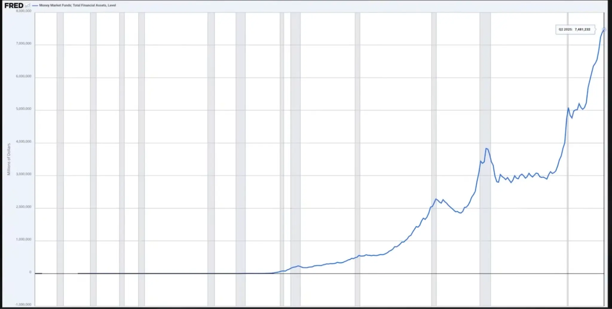 Similarly, the size of money market funds has also grown rapidly, reaching $7.5 trillion. These funds, after acquiring dollars, typically purchase short-term U.S. Treasury bonds, consistent with the pattern of stablecoins investing in short-term Treasury bonds after receiving funding. Both ultimately aim to achieve the same goal: assisting the U.S. Treasury in continuously refinancing its massive amounts of short-term Treasury bonds.
