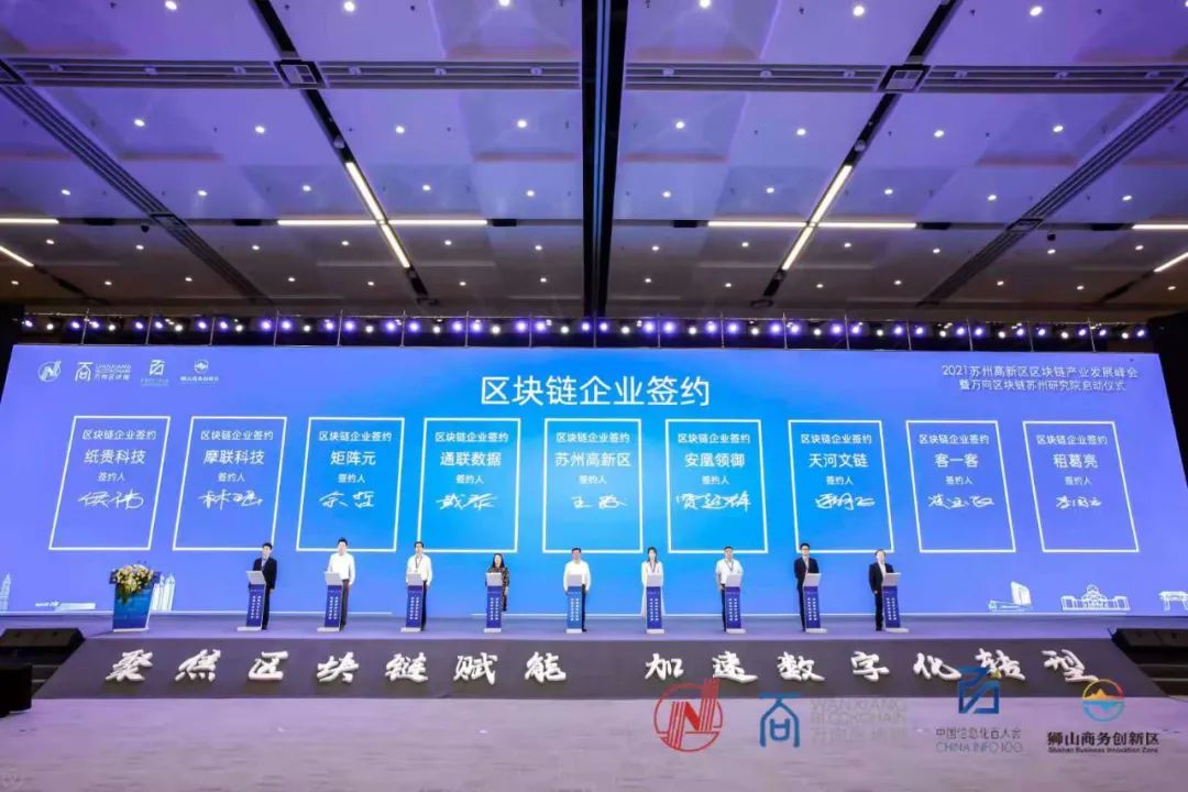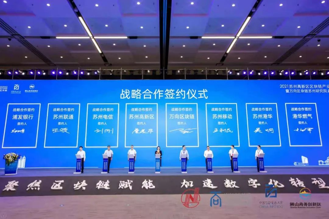 苏州移动、苏州电信、苏州联通、浦发银行苏州分行、苏州港华燃气、港华燃气等知名企业在大会上与苏州高新区及万向区块链苏州研究院签订了战略合作协议。安凰领御、天河文链、纸贵科技、租葛亮、矩阵元、通联数据、摩联科技、客一客等知名区块链企业也与苏州高新区签约落户。