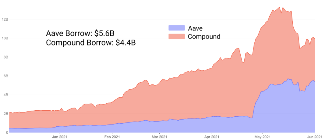 几个月前,Aave 的总存款超越了 Compound,部分原因是其流动性挖矿激励措施,并增加了额外的抵押品选项、稳定利率等功能。截至 6 月,Aave 借款总额也逆转了Compound,现在在存款和未偿还借款中都占据主导地位。