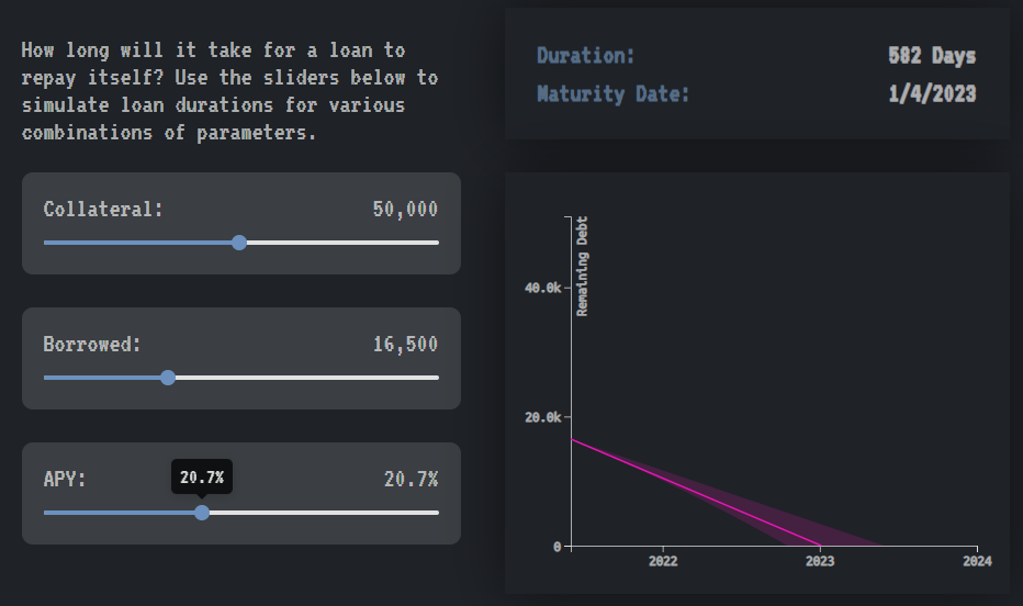 用户存入的 DAI 被发送到 Yearn Finance yvDAI 金库以赚取收益。他们不会为贷款支付利息,而是通过存入 Yearn 的 DAI 产生的收益自动偿还债务。此外,「transmuter」的收益会提高回报,「transmuter」是一种支持协议的机制,并作为锚定协议合成代币的主要机制。