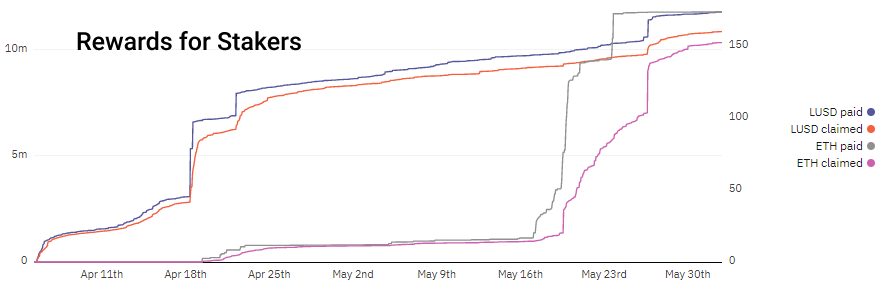 以 110% 的最低抵押率从 trove 发行的 LUSD 可以存入稳定池,在 LQTY 代币奖励中赚取约 36% 的 APR。LQTY 目前可以通过 Staking LQTY 获得高达 134% 的 APR。