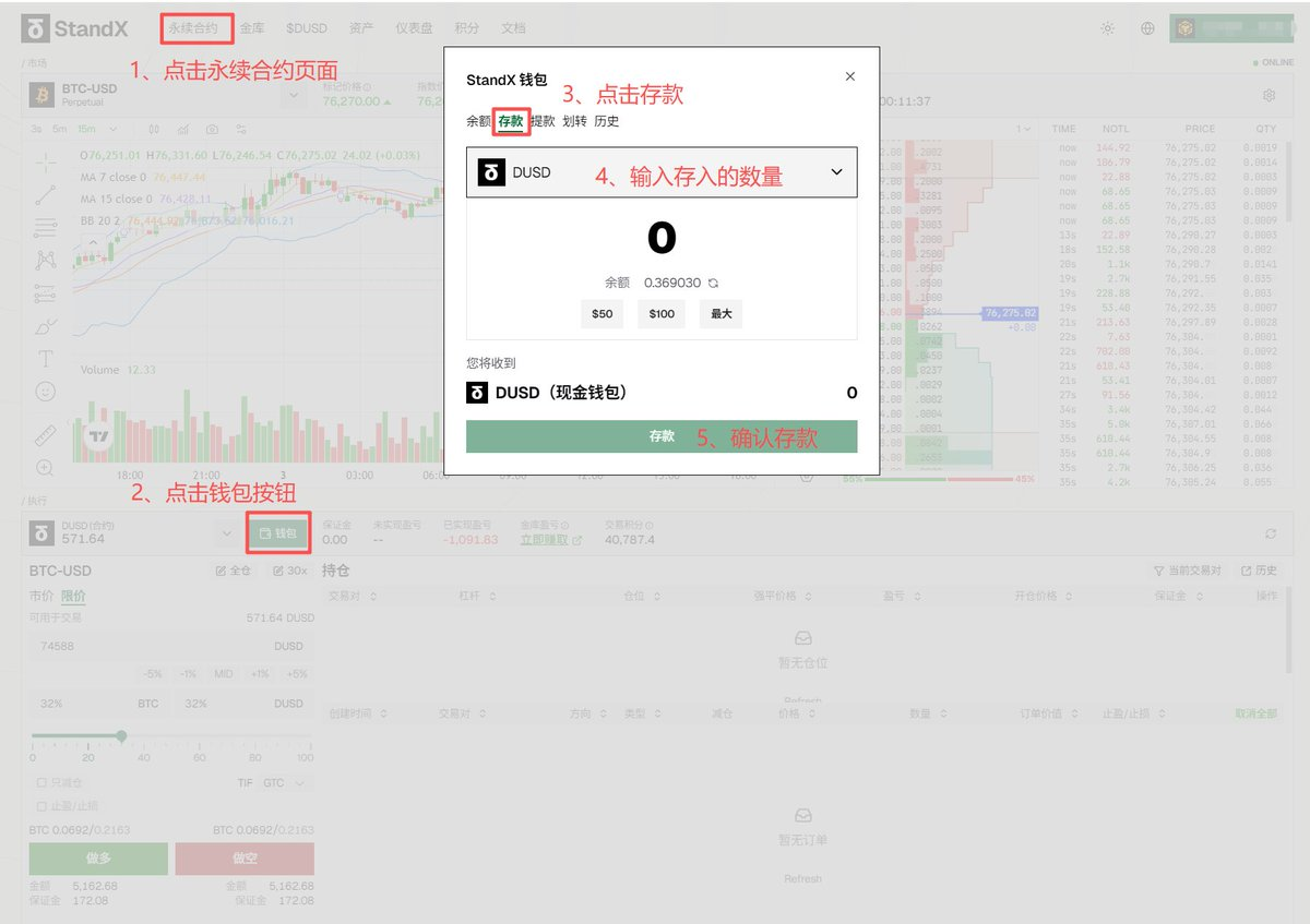 Step 1: Deposit the minted DUSD into your Perps account, as shown in the image.