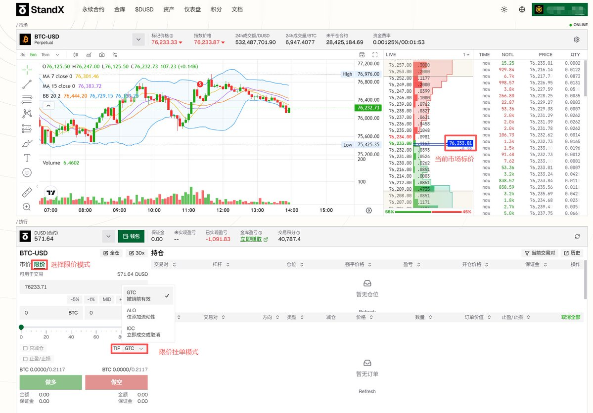 To earn order book points, you need to place limit orders in StandX's perpetual contract market to provide liquidity. The closer your order price is to the current market price, the higher your score. You can earn a lot of order book points even if your order is not filled.
