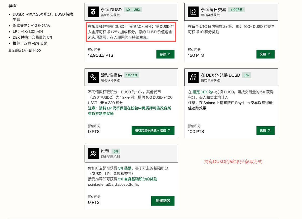 You can earn points simply by holding $DUSD in your wallet. You can also earn points through various other methods, such as using $DUSD to form LPs, depositing it into a Vault, or increasing trading volume on a DEX spot exchange.