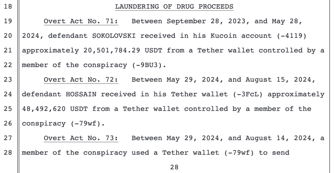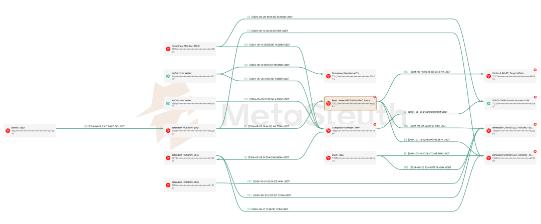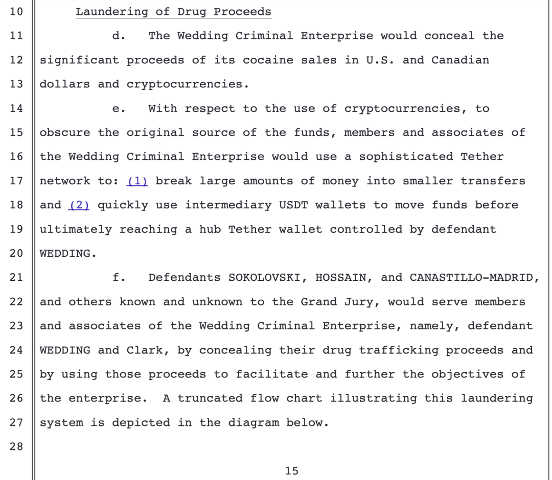 According to the indictment, the Wedding criminal syndicate primarily laundered drug proceeds in US dollars, Canadian dollars, and cryptocurrencies. Specifically, regarding cryptocurrency assets, the syndicate split large sums of money into multiple smaller transfers, quickly transferring them through intermediary USDT wallets, and ultimately depositing the funds into a central Tether wallet controlled by the defendant, Wedding.