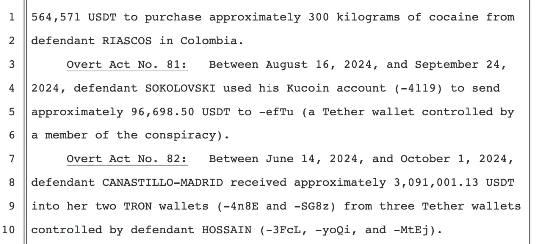 80 Public Act: Between August 15, 2024 and September 7, 2024, the defendant, Wedin, provided approximately 564,571 USDT to victim A, who acted as an intermediary, through a Tether wallet (-g1P1), for the purchase of approximately 300 kilograms of cocaine from the defendant, Riascos, in Colombia.