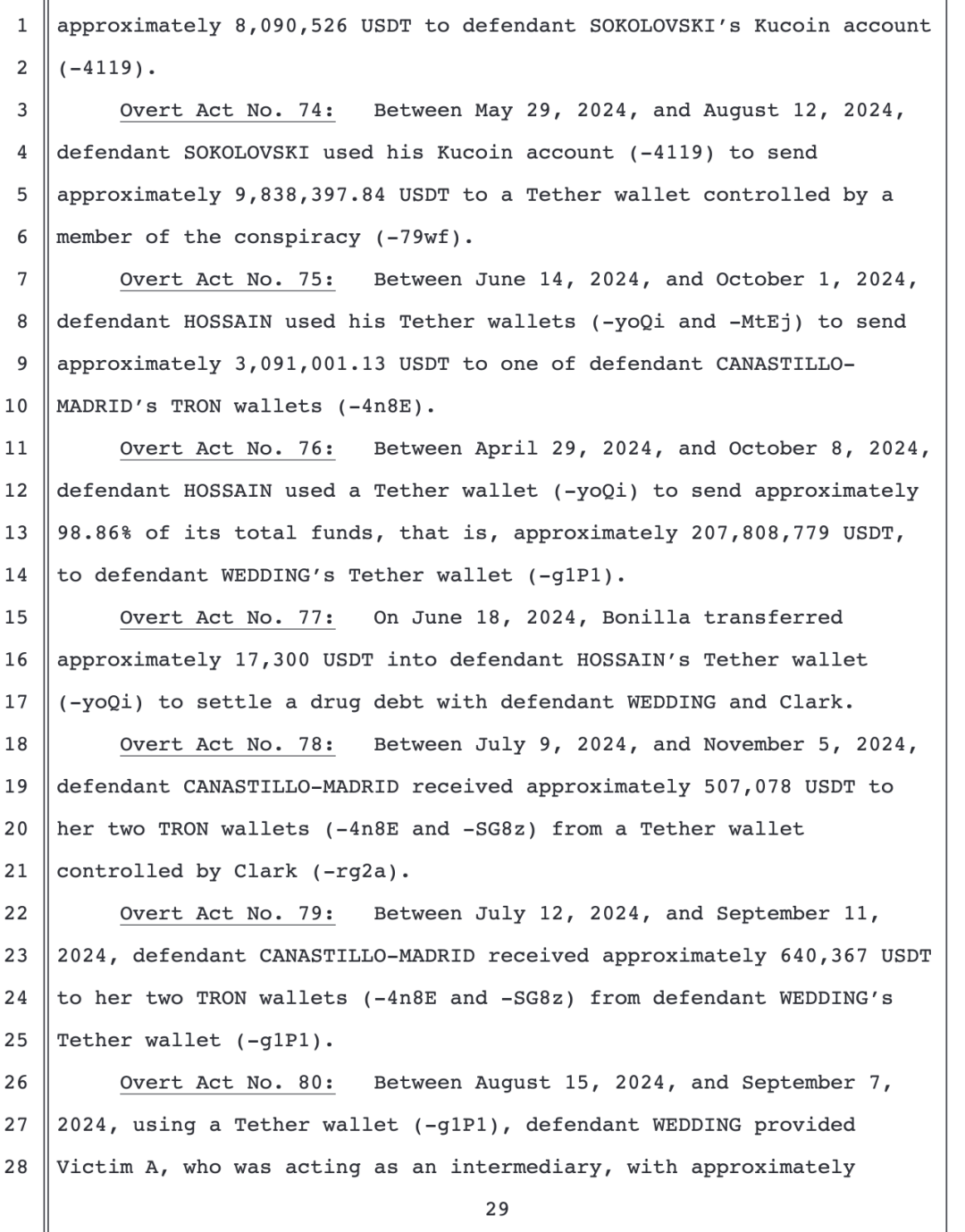 Item 75: Between June 14, 2024 and October 1, 2024, the defendant Hussein transferred approximately 3,091,001.13 USDT through his Tether wallet (-yoQi, -MtEj) to a TRON wallet (-4n8E) belonging to the defendant Canastillo-Madrid.