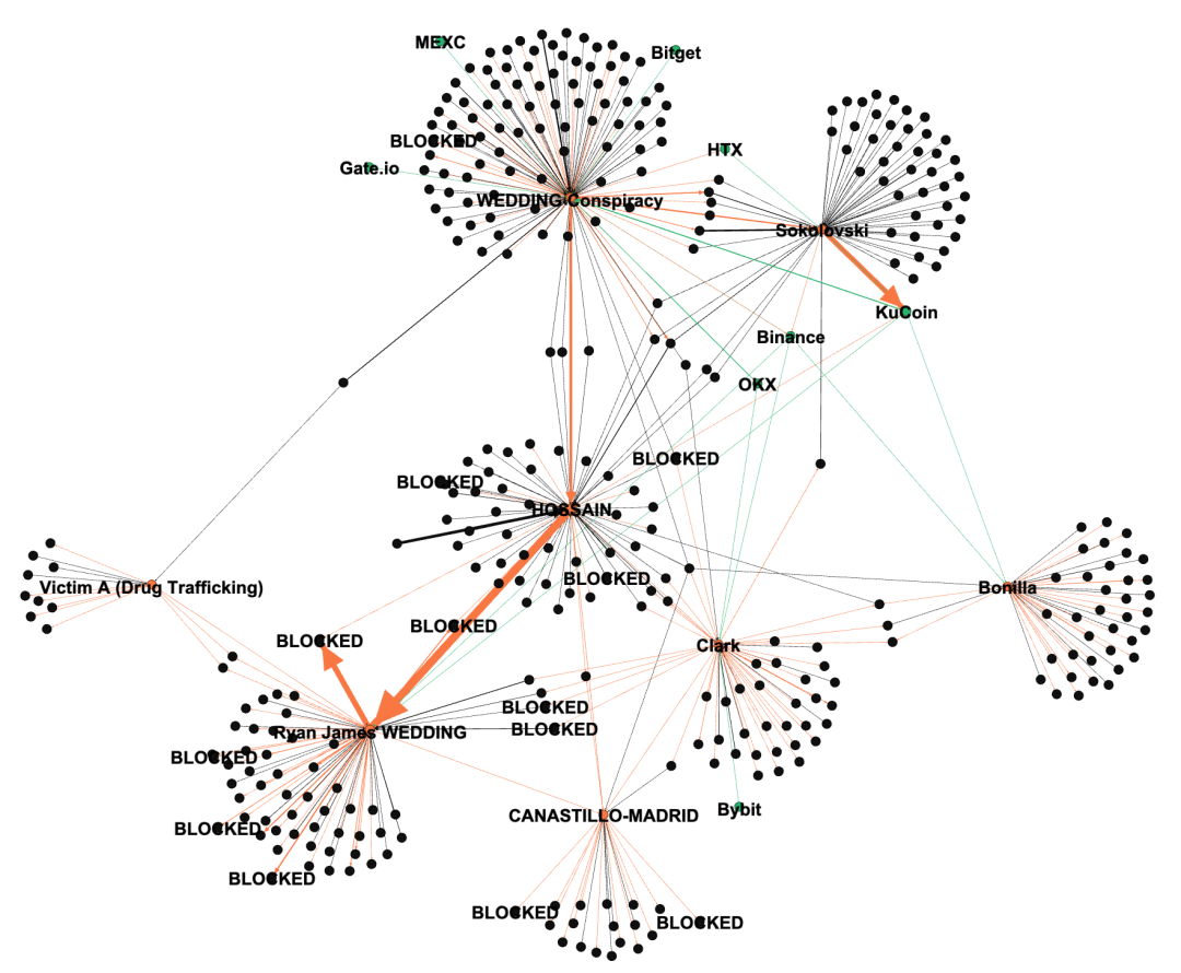 The fund flow diagram shows that HOSSAIN and SOKOLOVSKI constitute two significant fund aggregation centers, and the address cluster marked "WEDDING Conspiracy" is the main source of funds for these two centers.