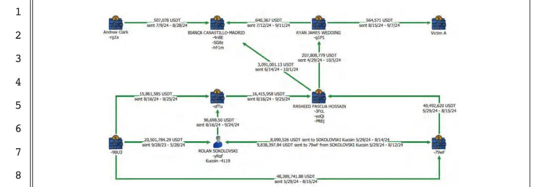 Item 82: Between June 14, 2024 and October 1, 2024, the defendant Canastillo-Madrid received approximately 3,091,001.13 USDT from three Tether wallets (-3FcL, -yoQi, -MtEj) controlled by the defendant Hussein in his two Tron wallets (-4n8E, -SG8z).