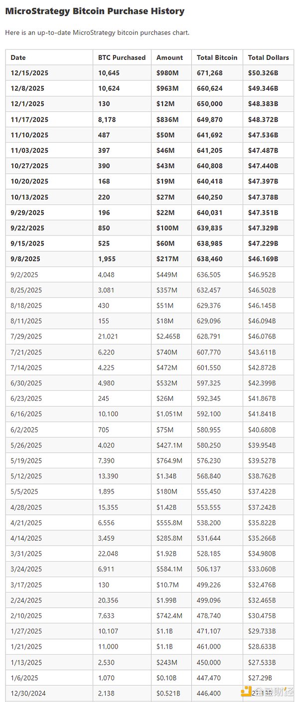 On December 30, 2024, Strategy held a total of 446,400 BTC; as of December 15, 2025, Strategy held 671,268 BTC. In nearly a year, Strategy purchased 224,868 BTC. Its holdings represent 3.197% of the total BTC supply.