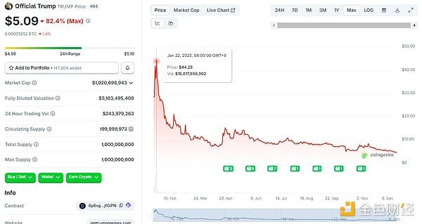 On January 18, Trump announced the launch of his personal Meme cryptocurrency, Trump. Upon its launch, Trump experienced a surge in price, reaching a high of over $44 on January 22. It subsequently plummeted, currently trading at $5.09, a drop of 82.4% from its January peak.