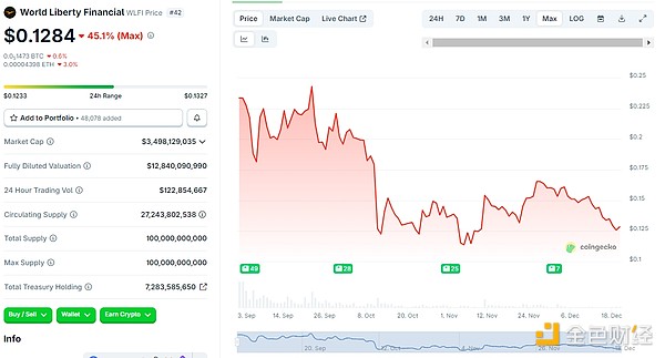 On September 16, 2024, World Liberty Financial, a decentralized finance project of the Trump family, was established. On September 1st of this year, several cryptocurrency exchanges listed WLFI for trading. However, it's clear that WLFI's popularity was merely a temporary fad; it peaked at $0.24 in its launch month, but as of this writing, it has fallen 45.1% to $0.1284.