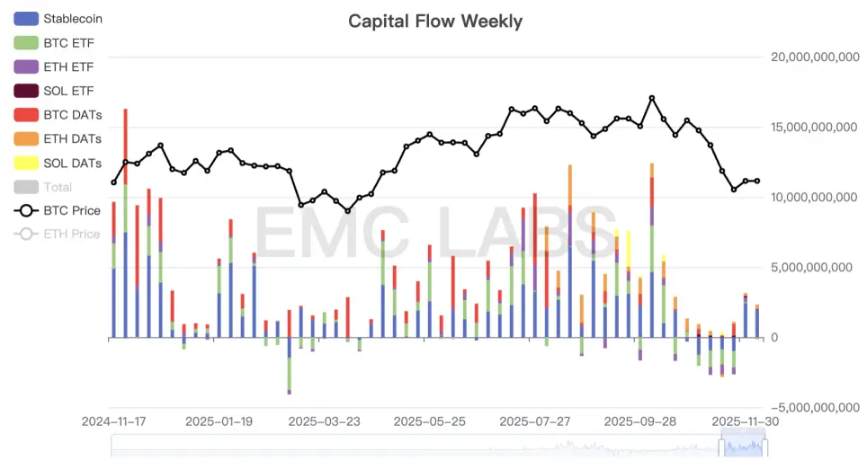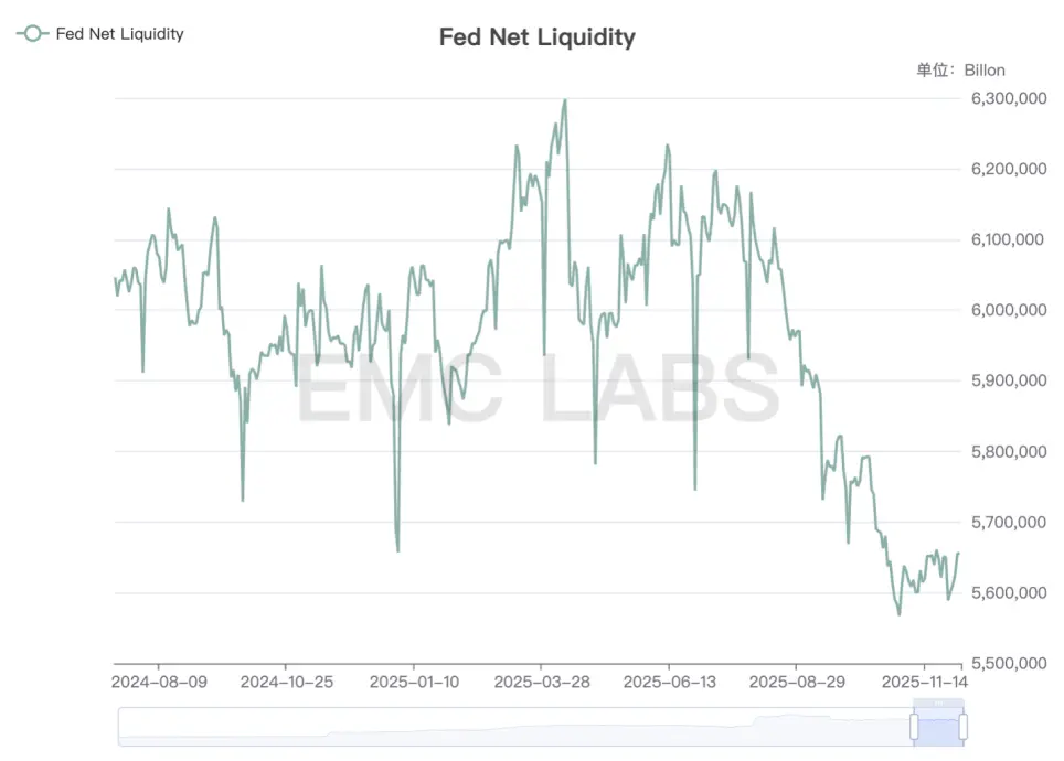 On the one hand, with the probability of a December rate cut returning to over 80%, the Federal Reserve halted QT and began releasing liquidity into the market in small amounts, and the Treasury's TGA account also began disbursement; on the other hand, panic selling and large-scale losses have come to an end. While panic selling pressure has decreased, the BTC price remains stagnant due to weak buying power.