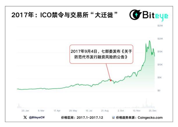 2017 was an extremely tumultuous year for the cryptocurrency market, and also a year of the most decisive regulatory action. On September 4th, seven ministries jointly issued the "Announcement on Preventing Risks of Token Issuance Financing," defining ICOs as illegal fundraising and requiring all domestic exchanges to shut down. Bitcoin closed at around $4,300 that day. However, in the week following the policy announcement, BTC briefly fell to as low as $3,000.
