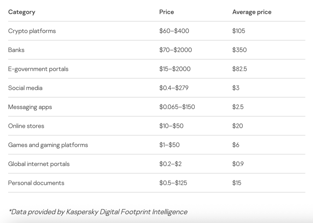 The table below shows examples of various account prices found on dark web forums as of 2025*.