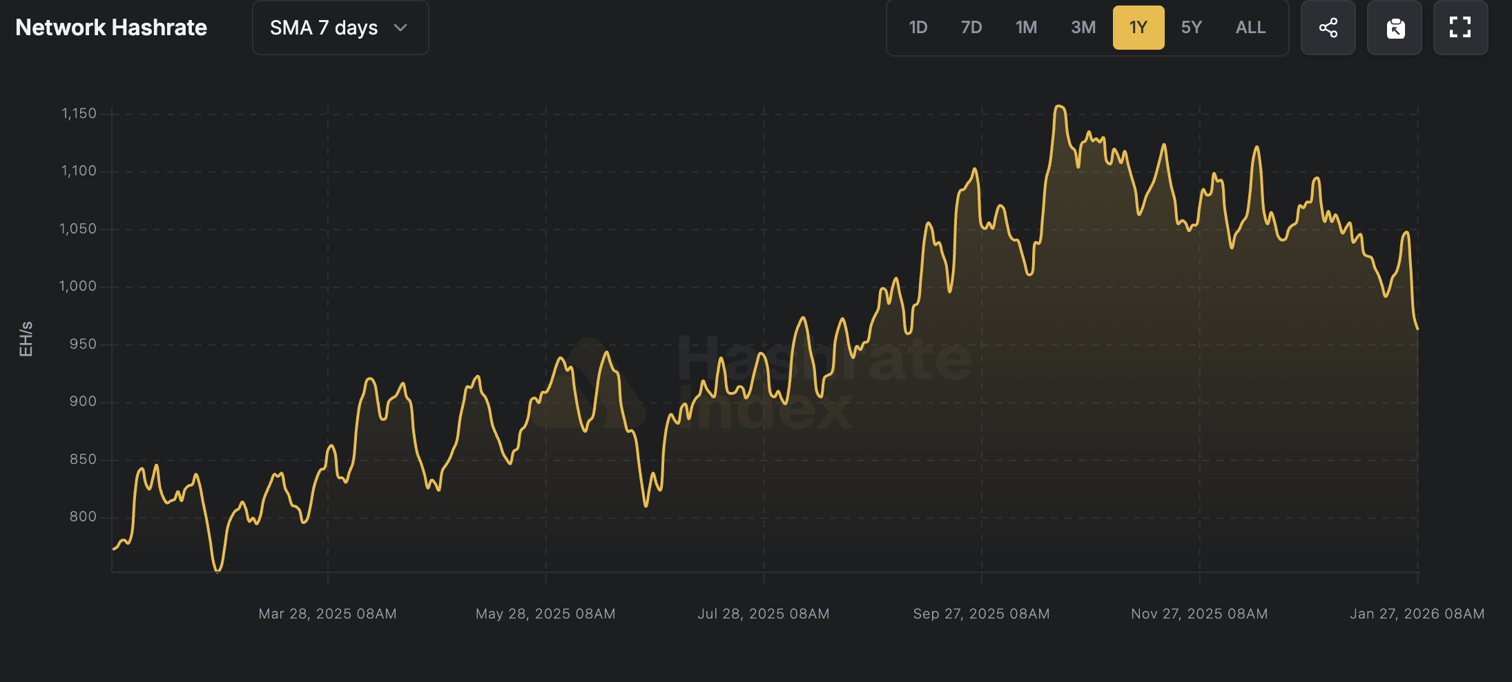 According to the latest data from the Hashrate Index, the 7-day moving average of Bitcoin's total network hashrate has fallen to 993 EH/s, a drop of nearly 15% from its all-time high in October last year. Meanwhile, according to JPMorgan analysts, the average daily block reward per EH/s for Bitcoin miners is projected to fall to $38,700 in December 2025, a record low.