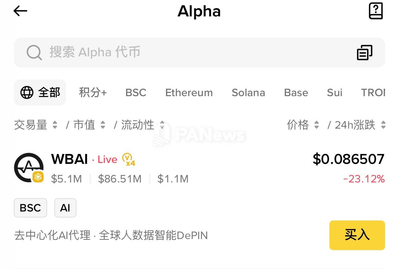 PANews reported on October 15 that the Binance APP page showed that Binance Alpha has launched WBAI.