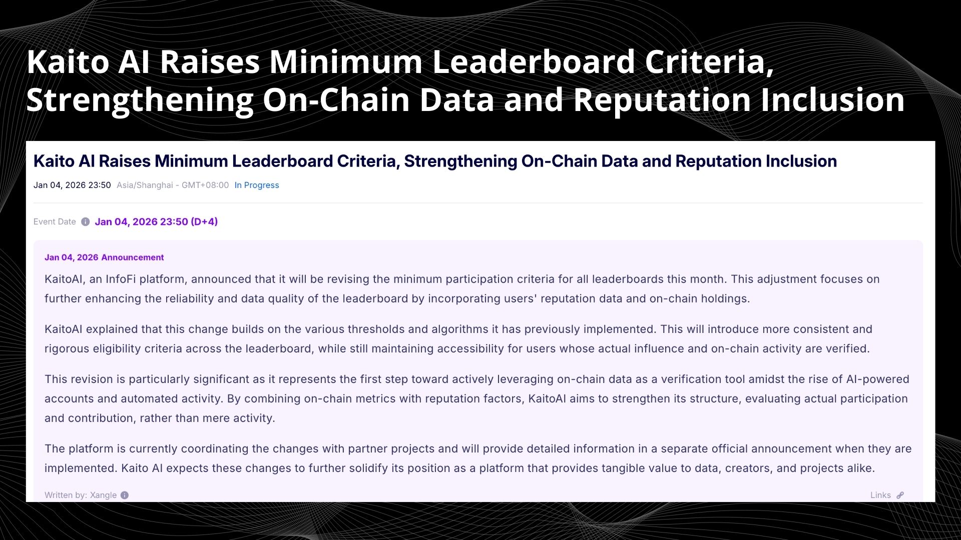 The most significant move occurred on January 4, 2026, when Kaito officially announced an upgrade to the entry standards for all leaderboards. This update, by introducing reputation data and on-chain holdings, fundamentally restructured the weighting logic of influence. This means that in the Kaito ecosystem, the "false prosperity" relying solely on AI scripts and automated posting has lost its place. The system begins to forcibly filter out low-quality activities by combining on-chain metrics and social reputation weights, ensuring that every piece of influence has genuine capital backing. Kaito is shifting from measuring "who is speaking" to measuring "who deserves to be taken seriously."
