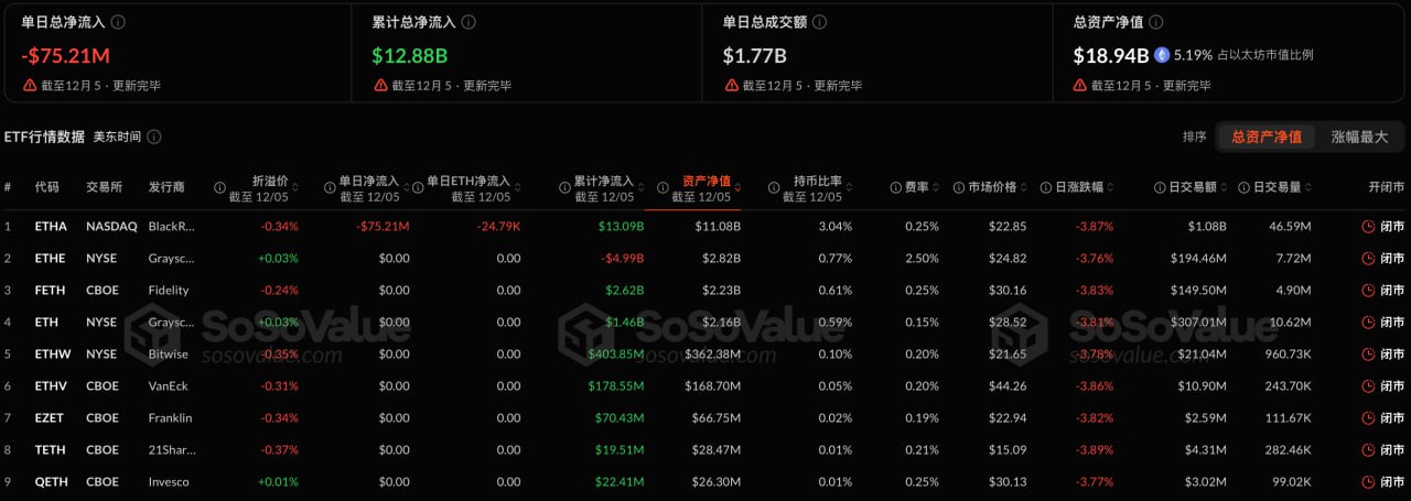 PANews reported on December 6 that, according to SoSoValue data, the Ethereum spot ETF saw a net outflow of $75.2065 million yesterday (December 5, Eastern Time).