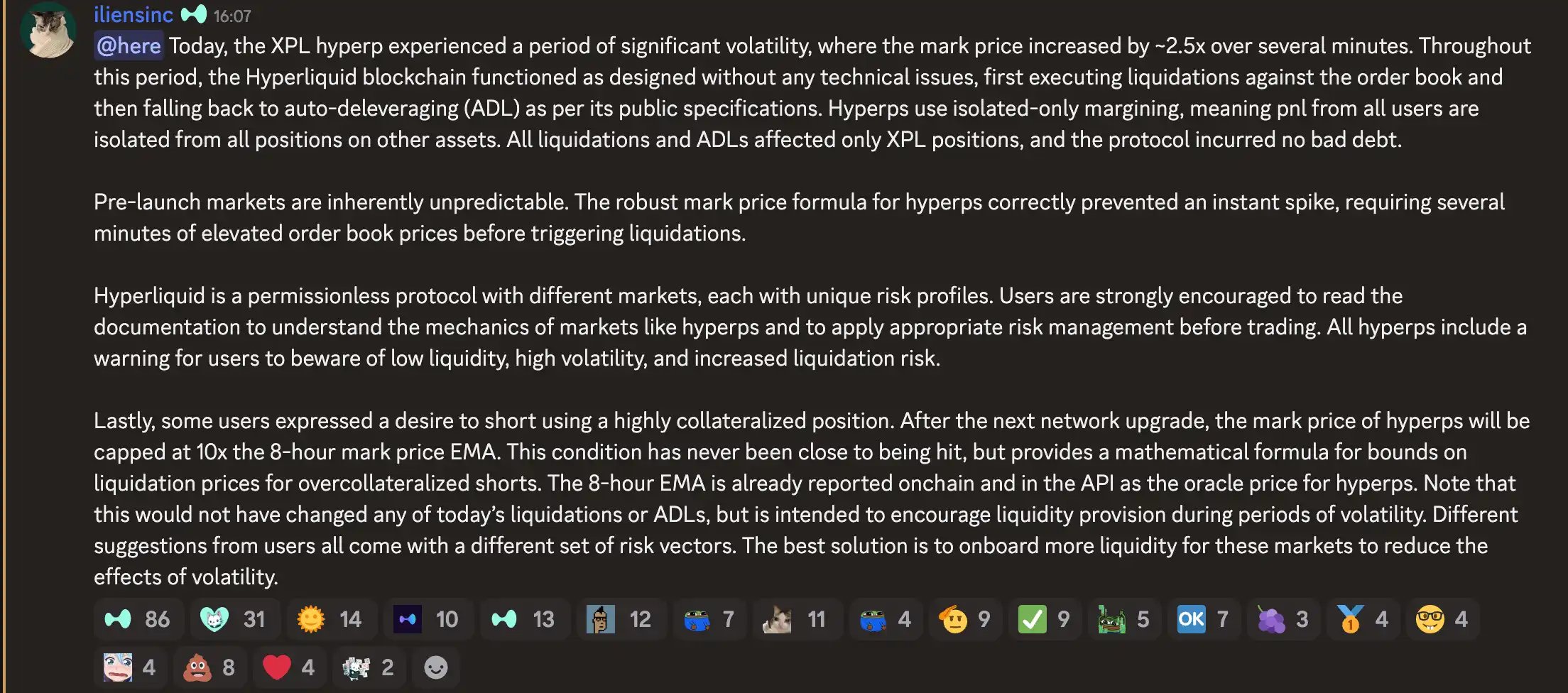 PANews reported on August 27 that @ai_9684xtpa monitored the Hyperliquid team's response to the XPL hedging attack on Discord, stating that there were no vulnerabilities in the platform and advising users to be aware of the risks. After the next network upgrade, the Hyperp mark price will be capped at 10 times the 8-hour mark price EMA.