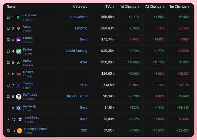 - Extended, Avnu, and Ekubo Protocol: Focused on BTC trading and liquidity. Ekubo is the largest automated market maker DEX on Starknet, featuring Uni v4-like scalability, support for dollar-cost averaging, and an upcoming limit order mode.