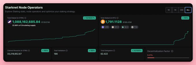 Native BTC staking functionality: A dual-token staking mechanism was implemented for the first time at the Starknet consensus layer. Within just one month of its launch, the staked amount reached 1791 BTC, worth approximately $166 million.