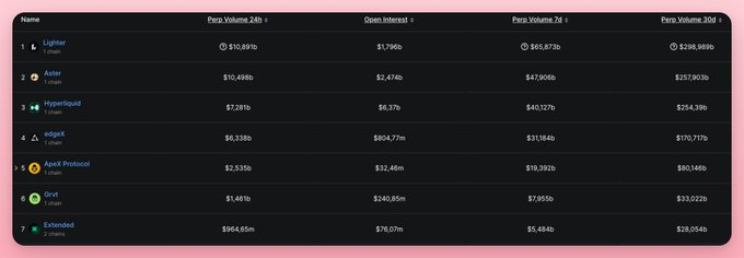 StarkWare's ZK stack powers three of the top ten perpetual contract DEXs, all of which are privacy-focused perpetual contract DEXs. It currently faces fierce competition from Hyperliquid and Aster.