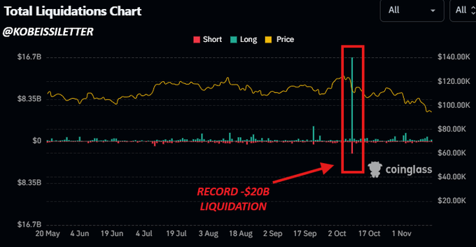 As happened on October 11, a $19.2 billion liquidation frenzy caused Bitcoin to drop by $20,000 on its first daily candlestick chart.