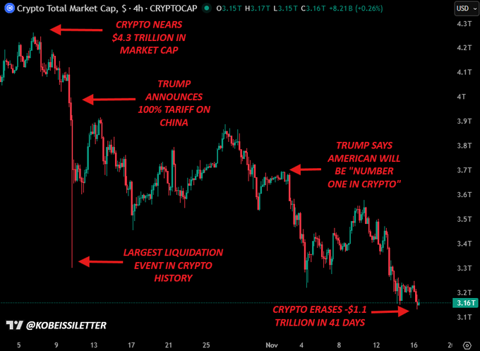 Over the past 41 days, the total market capitalization of cryptocurrencies has evaporated by $1.1 trillion, equivalent to a daily loss of $27 billion.