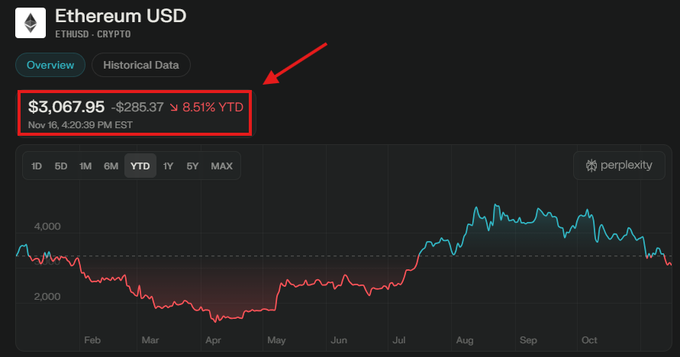 The downturn in the crypto market is even more pronounced in assets outside of Bitcoin. Ethereum, for example, has seen a year-to-date decline of -8.5%. Since October 6th, Ethereum has fallen sharply by 35%.