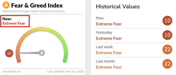 This also explains the sudden shift in market sentiment. The crypto market fear and greed index has officially fallen to 10, which is "extreme fear".