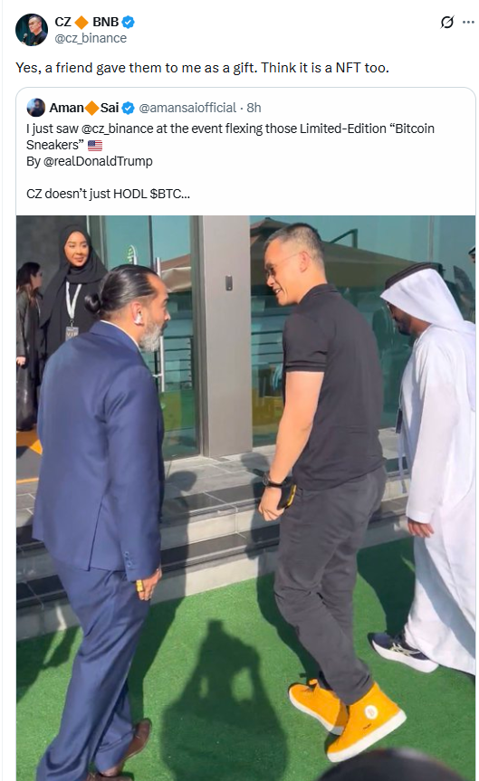 PANews reported on December 10 that Binance founder Changpeng Zhao reposted a photo of himself wearing Trump's limited edition Bitcoin Sneakers, stating that the shoes were a gift from a friend and that he considered them to be NFTs.