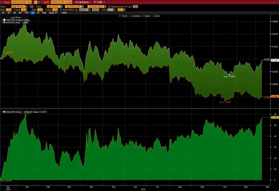 This indicator may be unfamiliar to ordinary investors, but it is actually the most direct signal for the market to judge "who controls long-term interest rates". Recently, the spread between 12-month US Treasury bonds and 10-year Treasury bonds has once again approached a high point. This round of rise is not due to a good economy or rising inflation, but rather the market is reassessing: in the future, the Treasury Department may not be the one determining long-term interest rates.