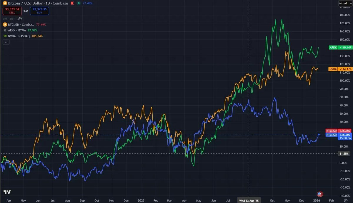 Bitcoin had previously been closely correlated with the performance of US tech stocks until around August 2025, when it began to lag significantly behind ARKK and Nvidia, followed by a crash on October 10th, and has yet to make up for the previous gap.