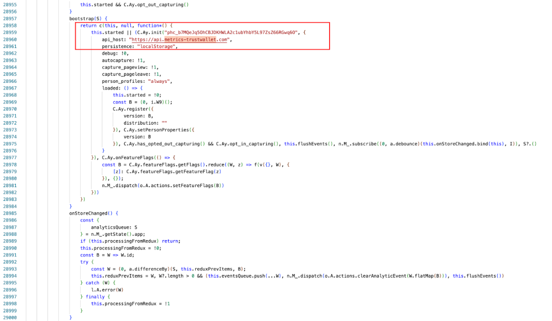 This backdoor incident stemmed from malicious source code modification of Trust Wallet's internal codebase (analysis service logic), rather than the introduction of a tampered generic third-party package (such as a malicious npm package). The attackers directly modified the application's own code, using the legitimate PostHog library to redirect analytics data to a malicious server. Therefore, we have reason to believe this was a professional APT attack, and the attackers may have gained control of the devices or deployment permissions of Trust Wallet's developers before December 8th.
