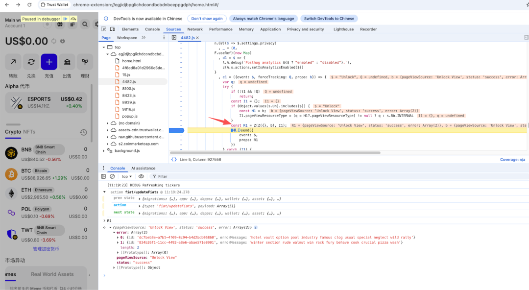 Dynamic analysis reveals that after unlocking the wallet, attackers can be seen filling the error field with mnemonic phrase information in R1.