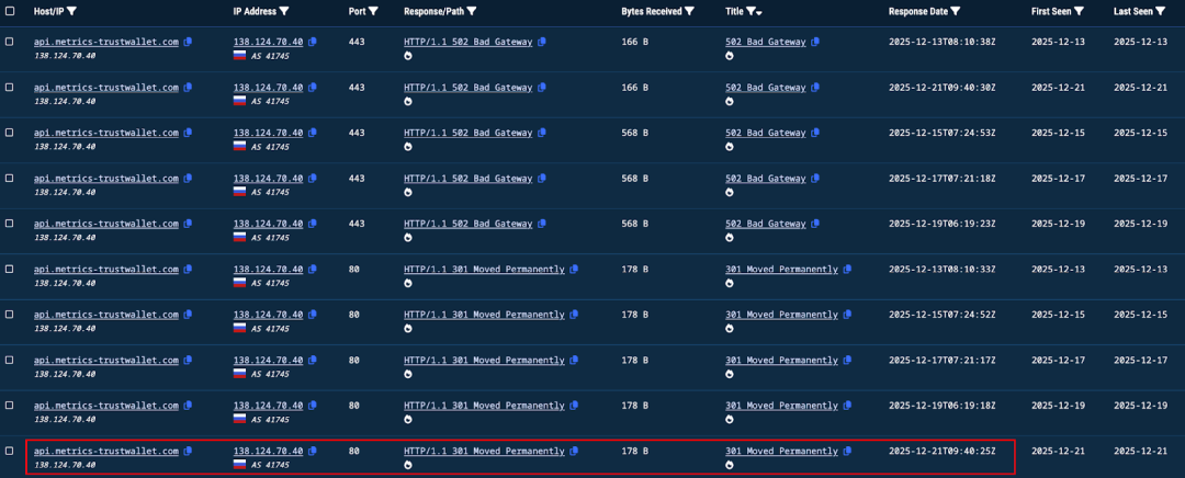 The first request to api.metrics-trustwallet[.]com was recorded on December 21, 2025.