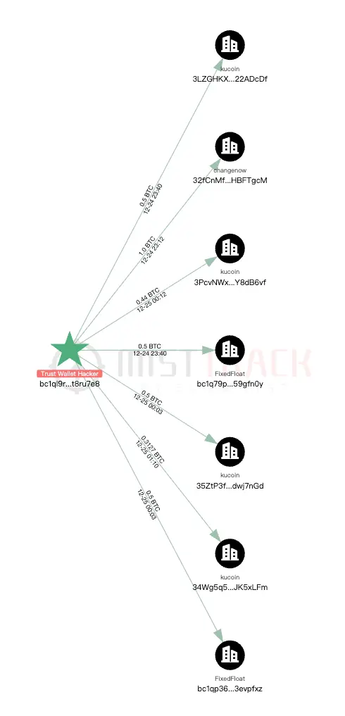 According to the hacker addresses disclosed by ZachXBT, our statistics show that, as of the time of writing, approximately 33 BTC (worth about 3 million USD) of assets were stolen from the Bitcoin blockchain, approximately 431 USD from the Solana blockchain, and approximately 3 million USD from various blockchains including the Ethereum mainnet and Layer 2. After the theft, the hackers transferred and exchanged some of the assets using various centralized exchanges and cross-chain bridges.