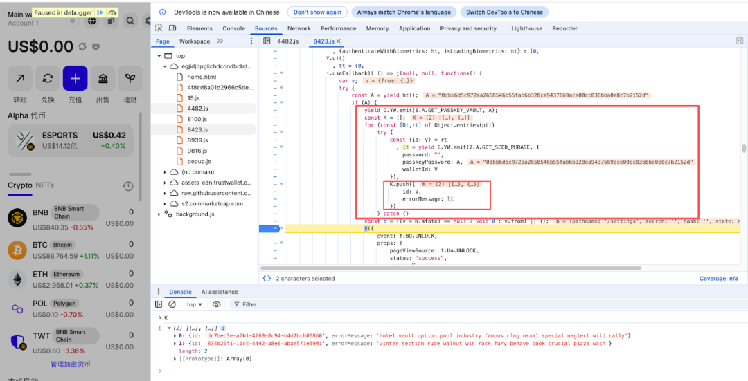 The source of this error data is obtained through the GET_SEED_PHRASE function call. Currently, Trust Wallet supports two unlocking methods: password and passkeyPassword. When unlocking, the attacker obtains the password or passkeyPassword, then calls GET_SEED_PHRASE to obtain the wallet's mnemonic phrase (the private key is similar), and then puts the mnemonic phrase into the "errorMessage".